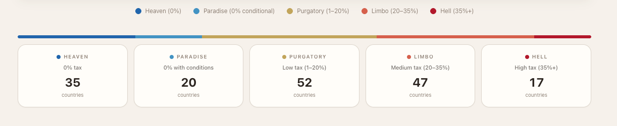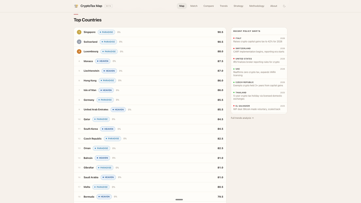 Partially as an experiment in what AI tools can actually do when you need comprehensive research at scale. Partially because I was tired of answering the same question twenty different ways: “Which countries have favorable crypto tax treatment?”
