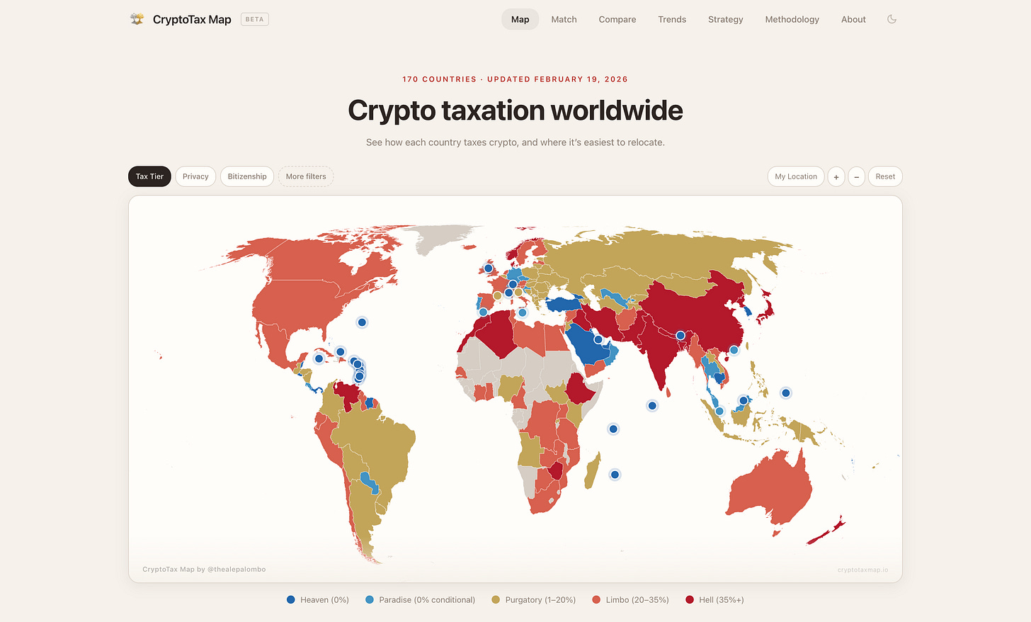 The Map: Visual overview of all 170 countries color-coded by tax tier. See at a glance which jurisdictions have 0%, low, moderate, high, or very high crypto tax.