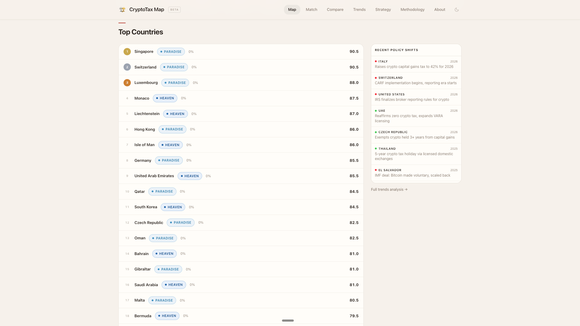 Luxembourg (88.0) outranks Monaco (87.5) despite Monaco having better weather and no income tax at all. Why? Regulatory framework, EU harmonization and actual crypto businesses can operate there without constant legal uncertainty.