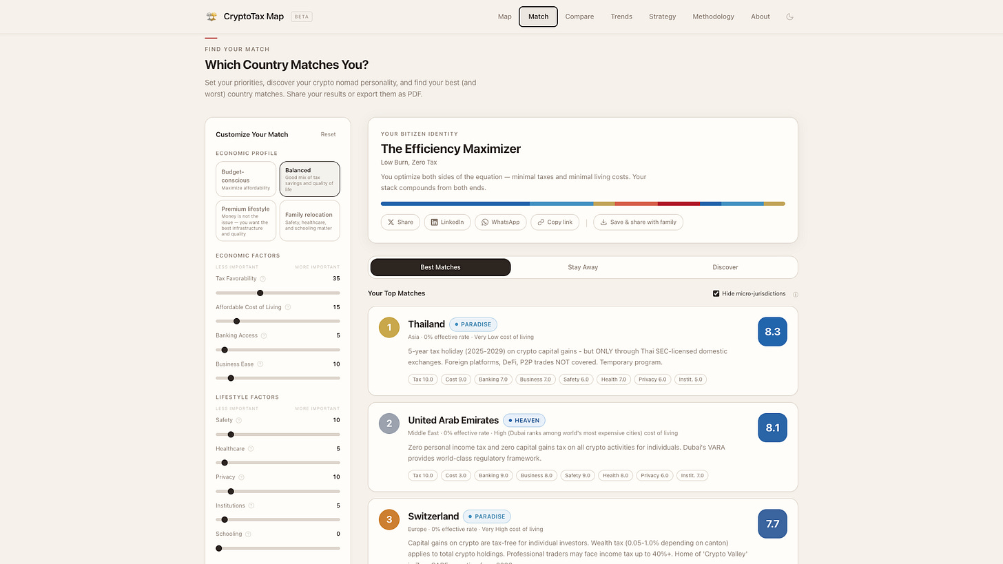 You set your priorities – tax rate, safety, privacy, healthcare quality, cost of living, golden visa availability – and it scores every country against your specific situation. Not some generic “best countries” list but close to your optimal list.